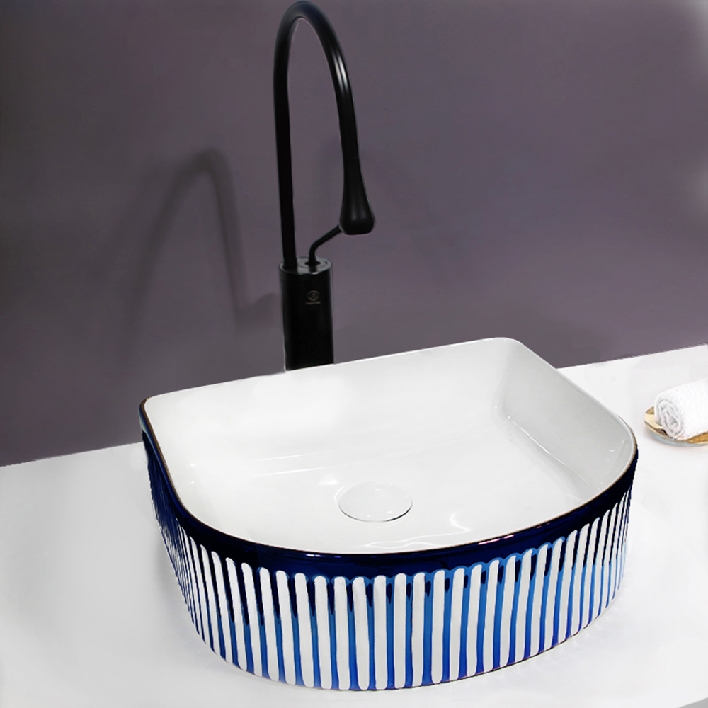 Abraza el flujo de la elegancia con el Lavatorio AquaGlide, una obra maestra del diseño que combina a la perfección una forma única en D con cautivadores bordes azules. Su interior blanco impoluto y su exterior adornados con bordes azules dinámicos evocan el refrescante flujo del agua, transformando tu baño en un santuario de tranquilidad y estilo moderno.